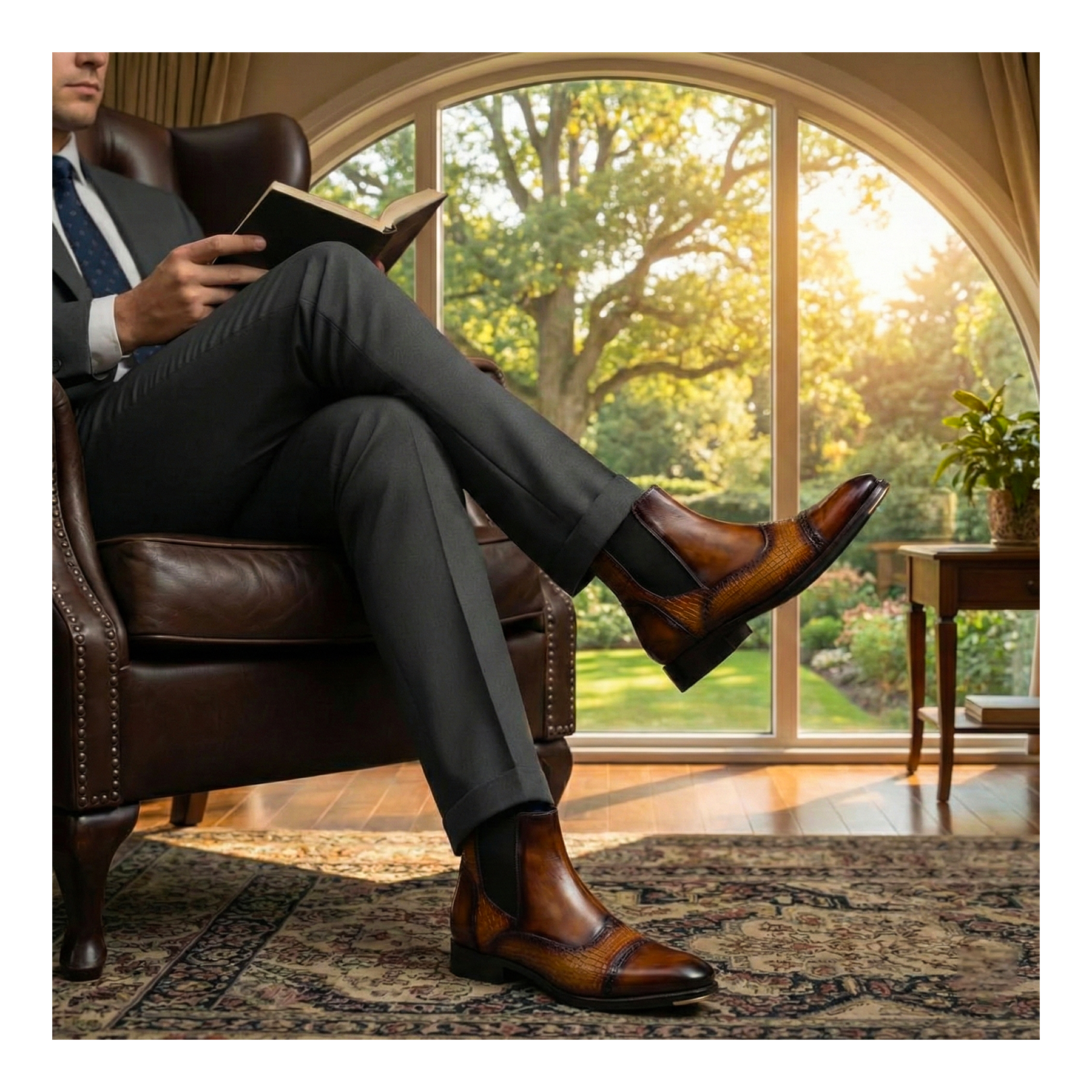 Has owning a sleek, shiny, and classy pair of leather Chelsea Boots been your desire for eons? Then, this classic pair of Captoe Chelsea boots in the croc tan shade is the best fit for your hangouts, formal parties, or that special brunch! Full-grain leather uppers with a design of Crocs embossed style add that extra charm to these shoes. Unlike the dull edgeless boots you might find at mass-produced outlets, these handmade custom Captoe Chelsea boots furnish a cutting-edge look that complements your boldness in the best possible way. Plus, the Blake stitch construction and cushioned insole greatly pamper your feet like never before.