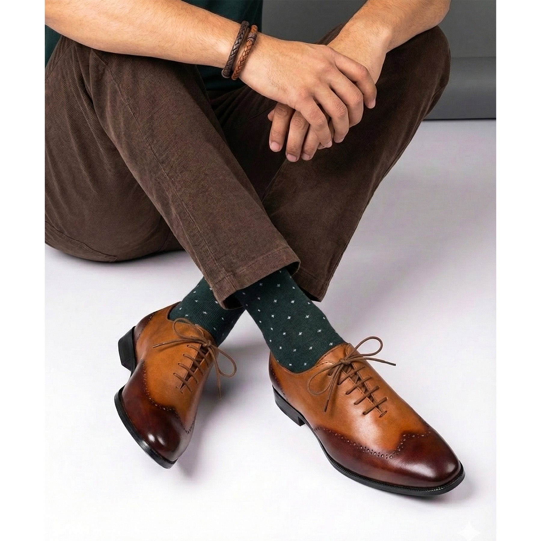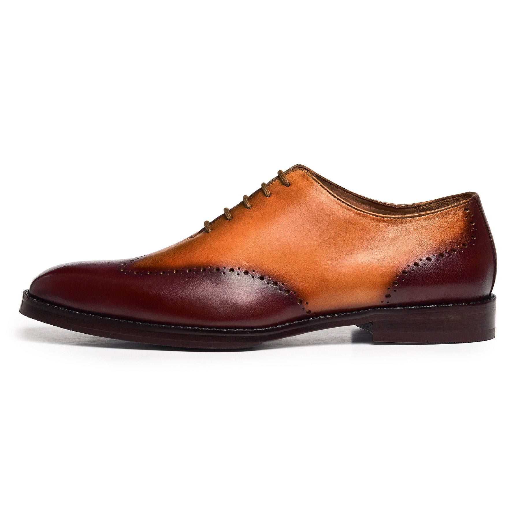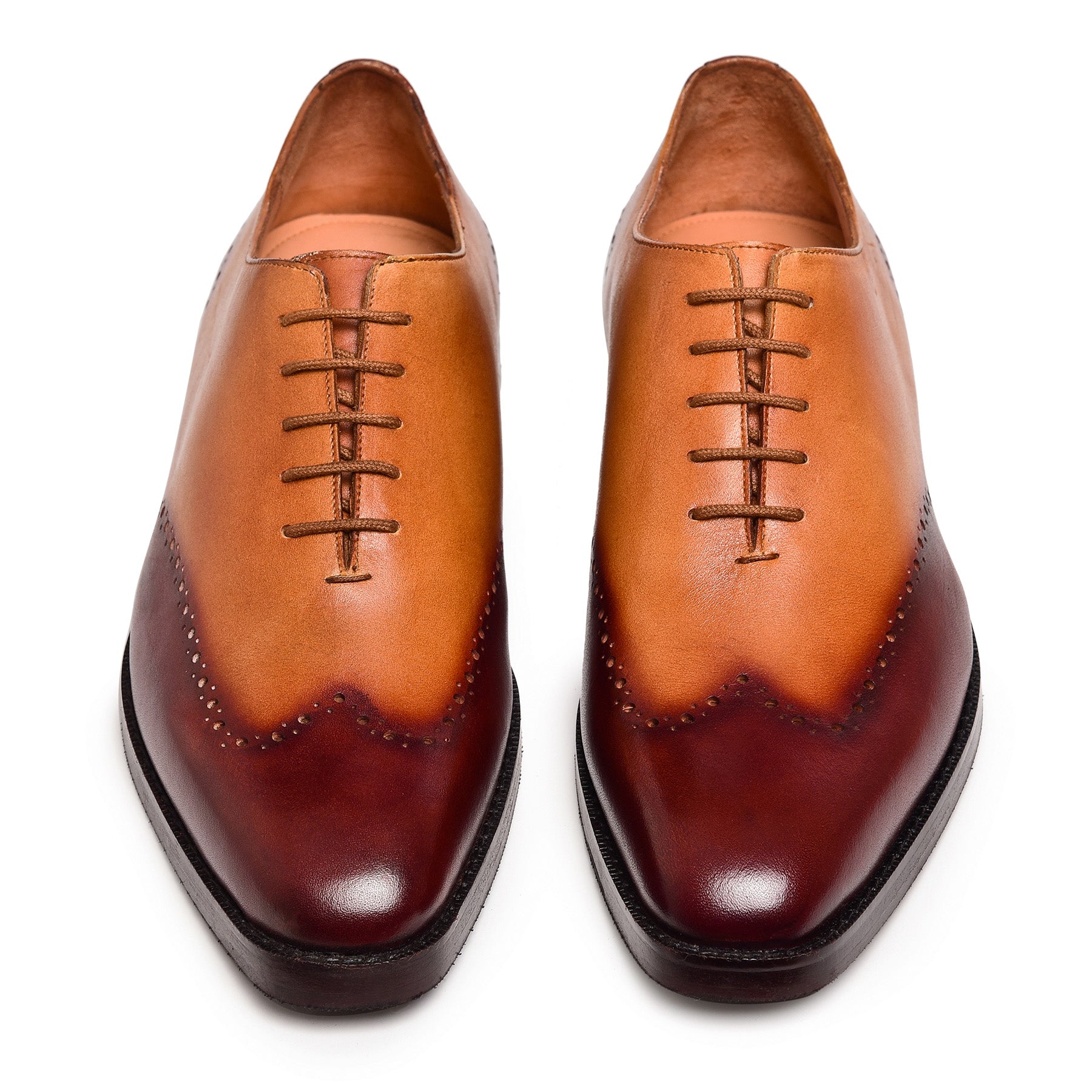 These Brown & Tan Wholecut Oxfords are defined by a hand-patinated full-grain leather finish and expert craftsmanship. Featuring an Argentinean leather sole with a rubber protector, along with full leather lining and cushioned insoles, they deliver elegance, comfort, and durability—perfect for formal occasions and refined everyday wear.