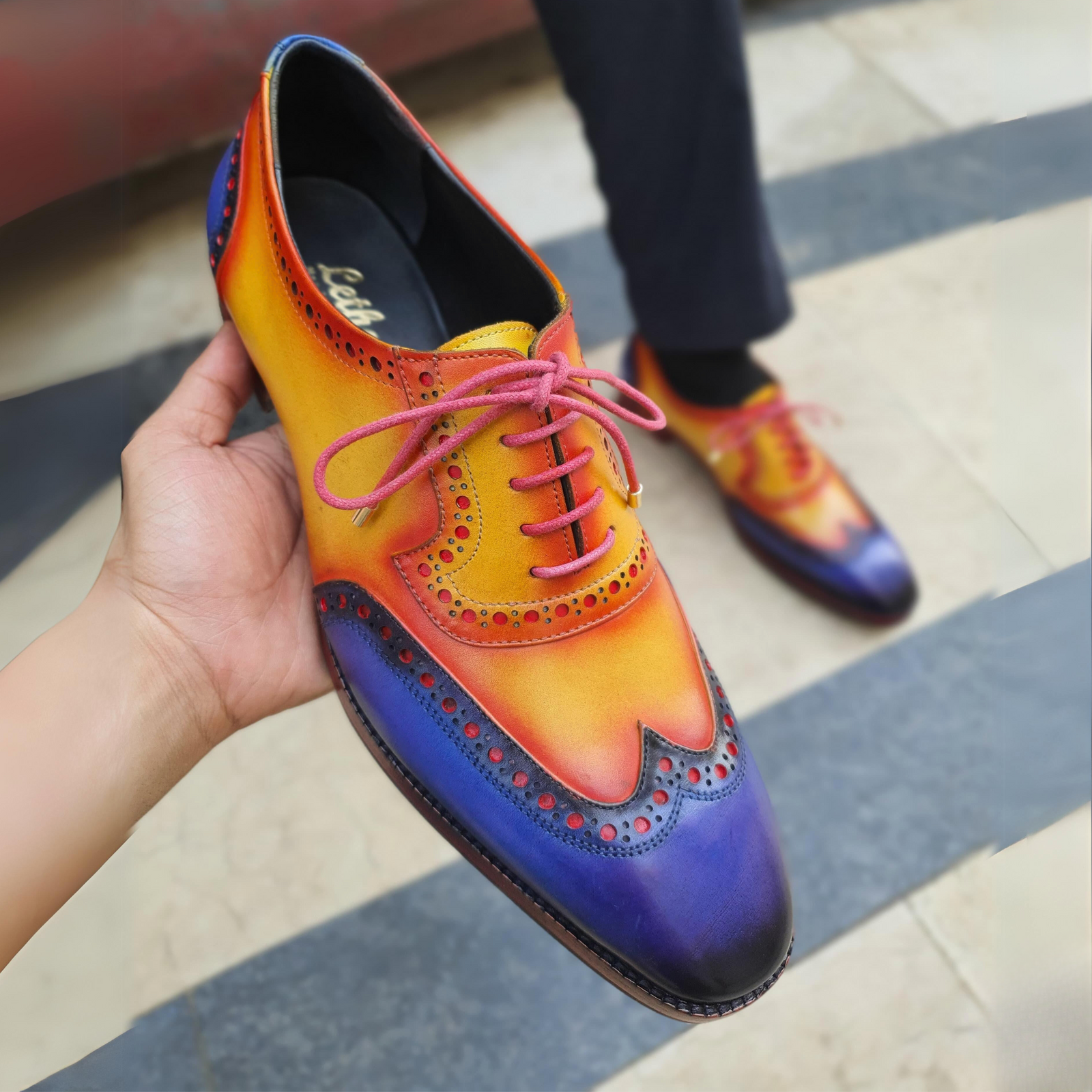 The Wingtip Brogue is the perfect blend of comfort and sophistication. Made from 100% calfskin crust leather, this classic brogue shoe has a handcrafted design that will provide you with years of wear. The tan and navy color combination pair perfectly with trousers or jeans for a look that's both classic and timeless.