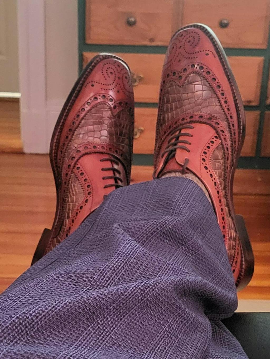 I'm very impressed by the quality of the leather on these shoes. It's tough finding such fantastic shoe designs these days, without getting some cheap Chinese synthetic material that comes with a stench. This is genuiine leather, with the styling to match, with traditional roots meeting modern class. They fit great, and the complimentary shoe horn helps get into them that much better. This is already my second pair, and I will keep buying more from this company. Customer service was excellent, as well.