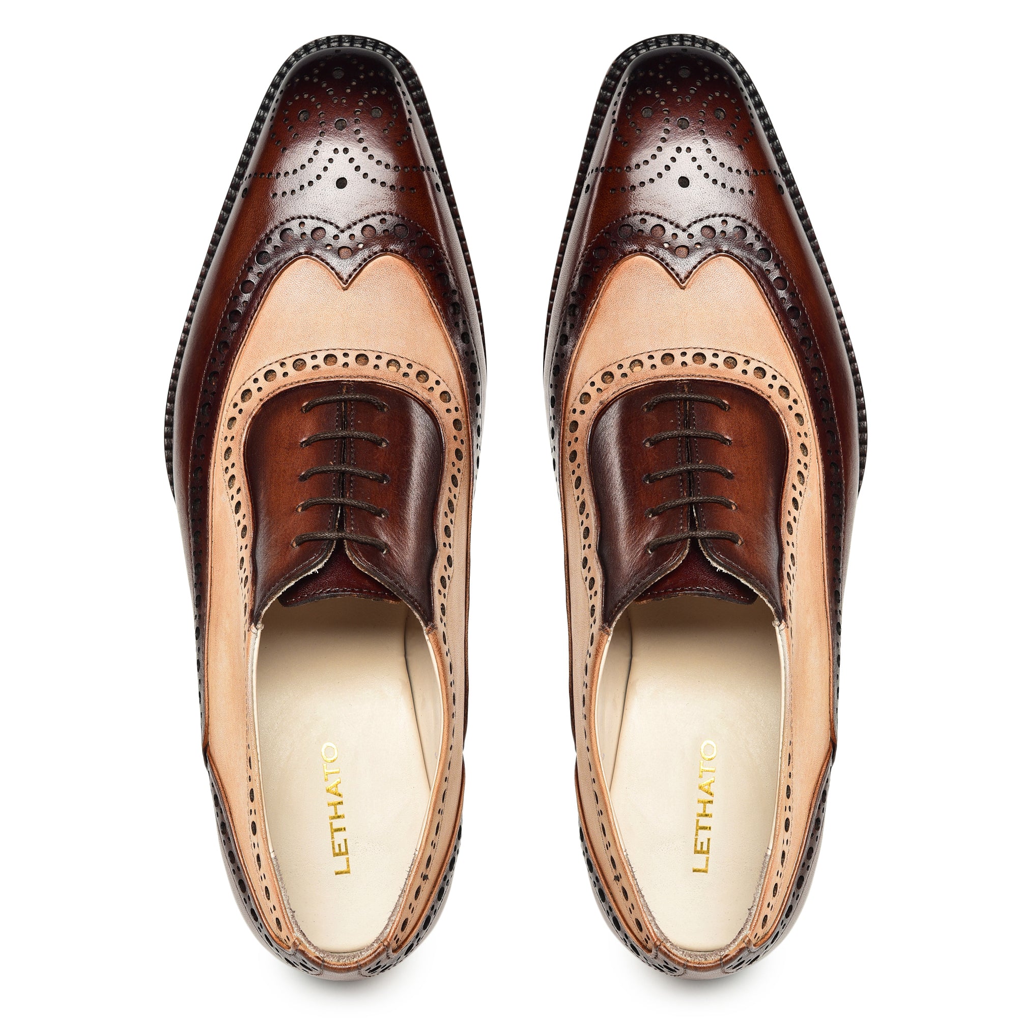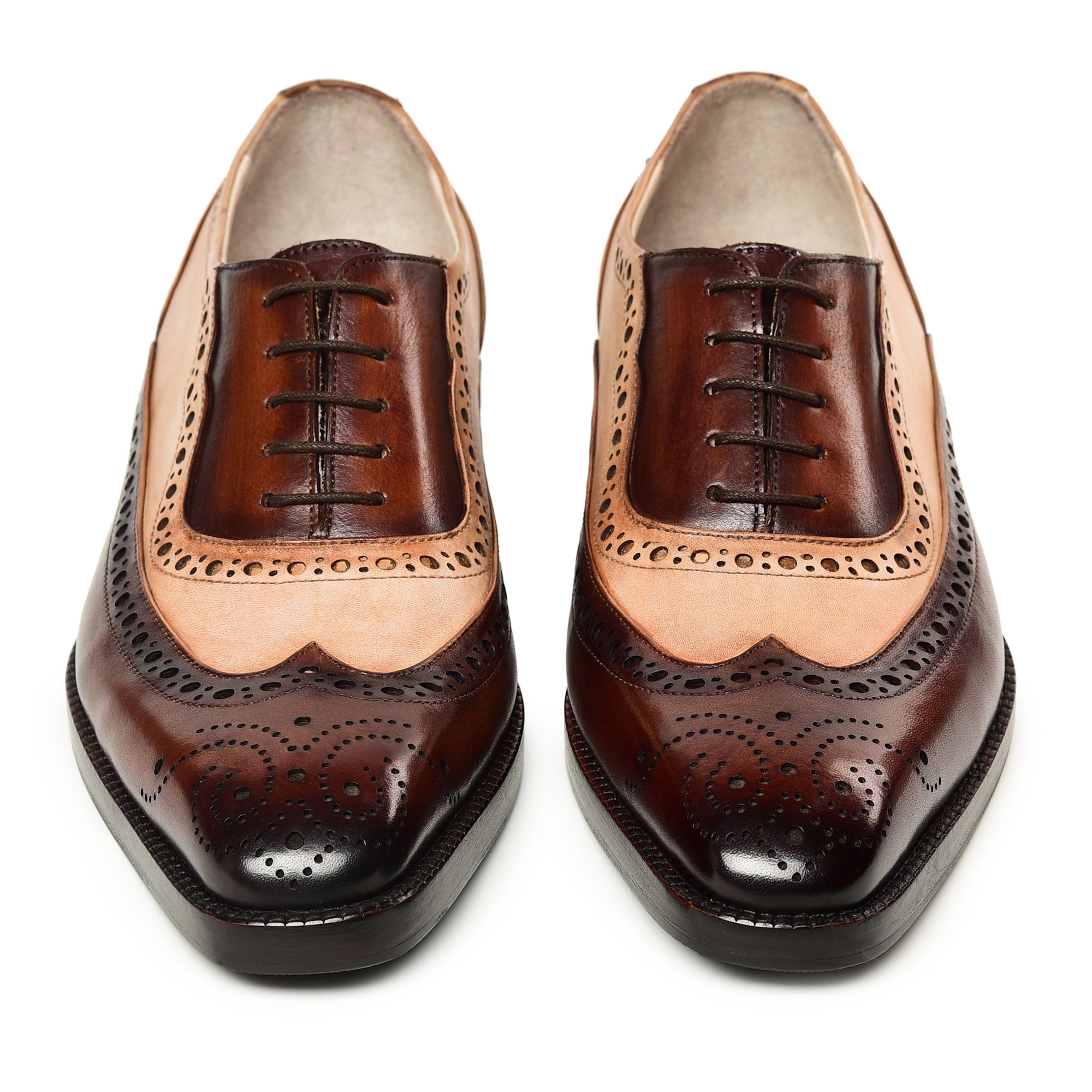 Elevate your formal wear with our Wingtip Brogue Oxfords in a sophisticated brown and beige color scheme. Crafted from full-grain leather, these men’s dress shoes feature meticulous hand-painting, ensuring each pair is a unique work of art. The classic wingtip design, complemented by intricate brogue detailing, adds timeless elegance to your ensemble. The high-quality leather provides durability and a refined finish, while the comfortable fit ensures all-day wearability. Perfect for making a statement at any occasion, these Oxfords blend traditional craftsmanship with modern style, making them a versatile and distinguished choice for the discerning gentleman.